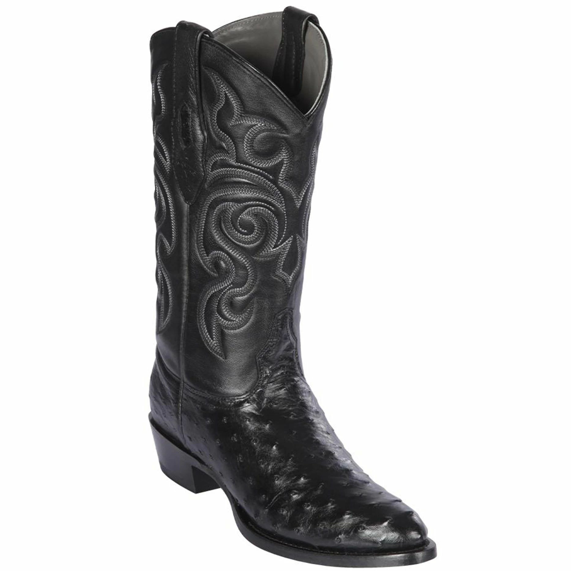 This men’s boot features a genuine full quill ostrich foot and a traditional round toe.