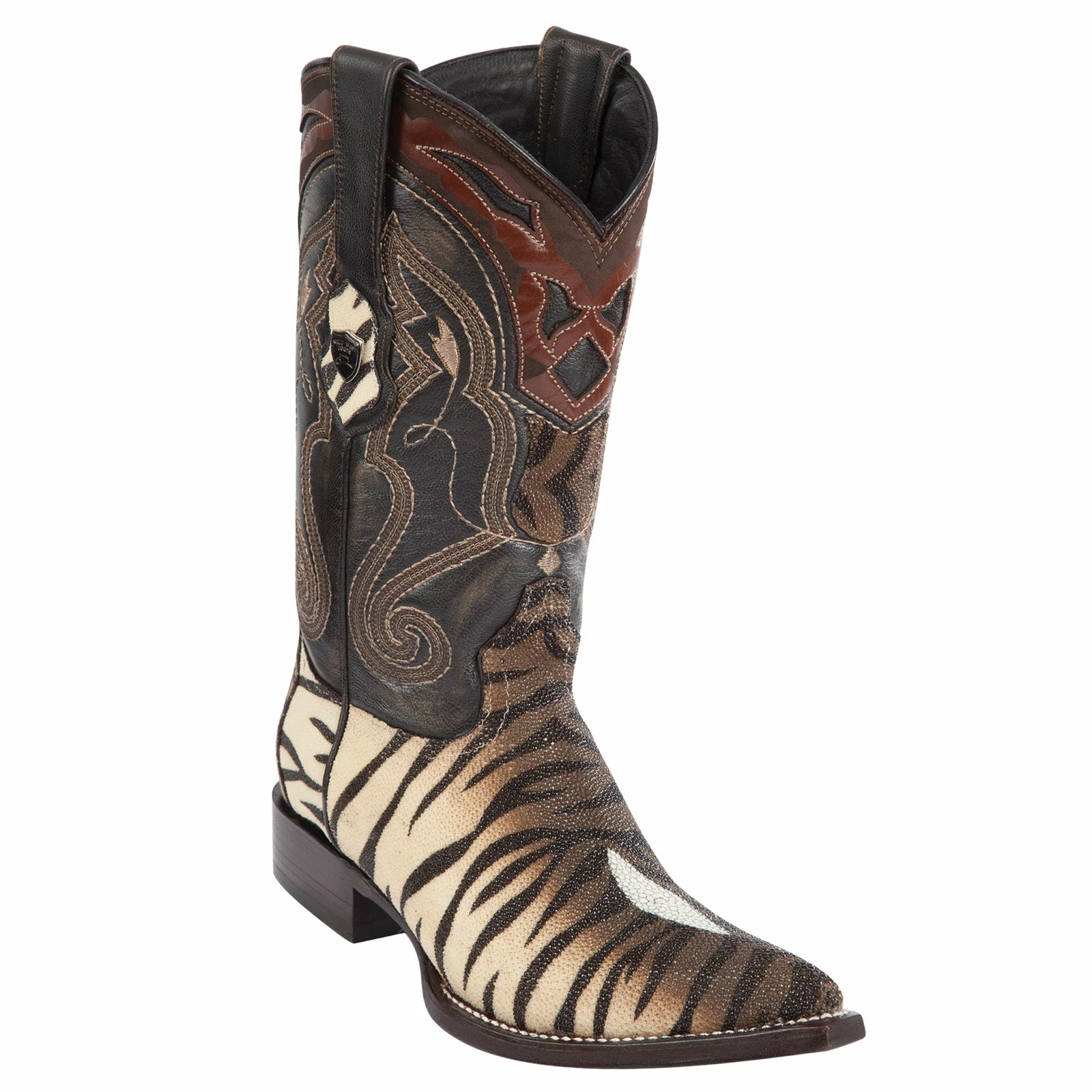 Looking for a pair of cowboy boots that are sure to make a statement? Check out Wild West Boots Pointy Tiger Stingray Cowboy Boots! These boots feature a unique tiger pattern on genuine stingray skin, giving them a bold and eye-catching look.