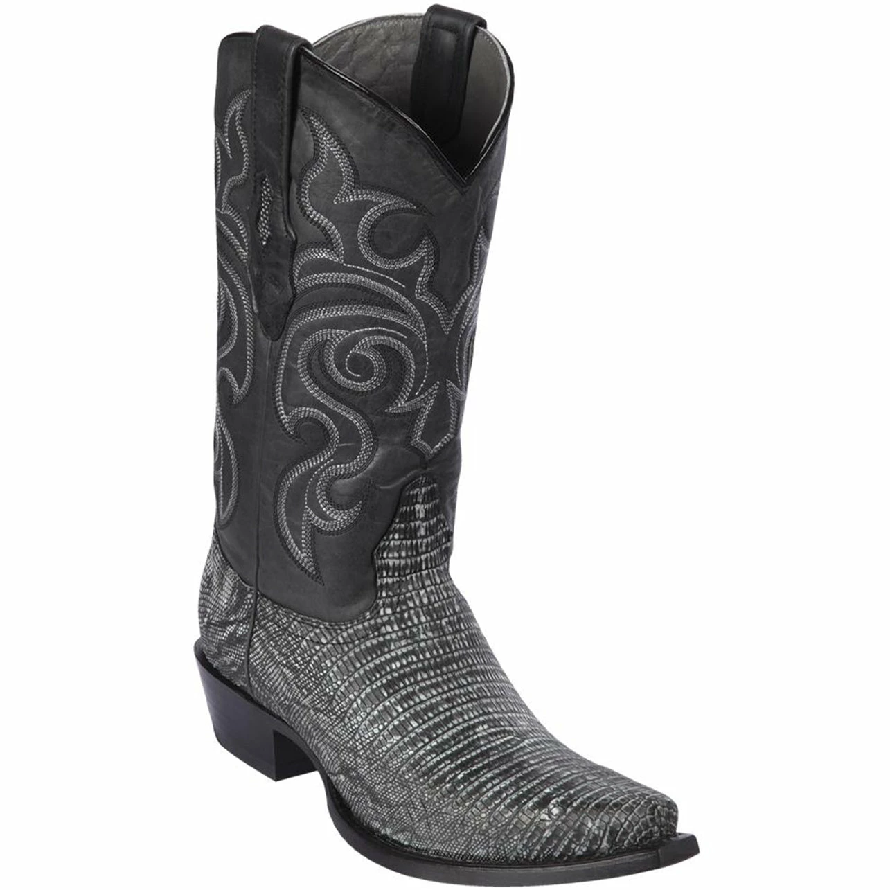Mens black lizard cowboy boots in a traditional snip toe profile and stitching pattern on upper.